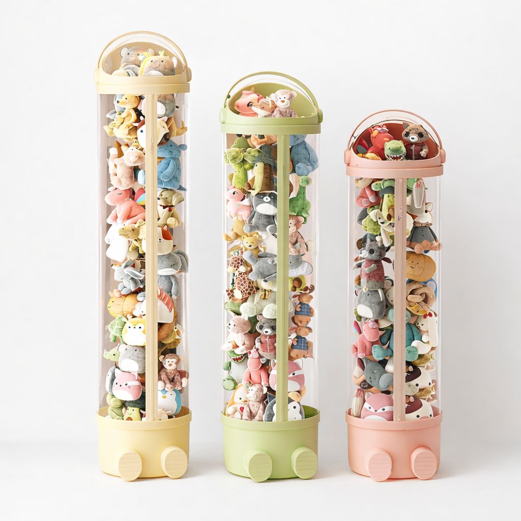 O formato vertical transparente permite que a criança veja todos os brinquedos e escolha facilmente seu favorito, incentivando autonomia e organização desde cedo.
